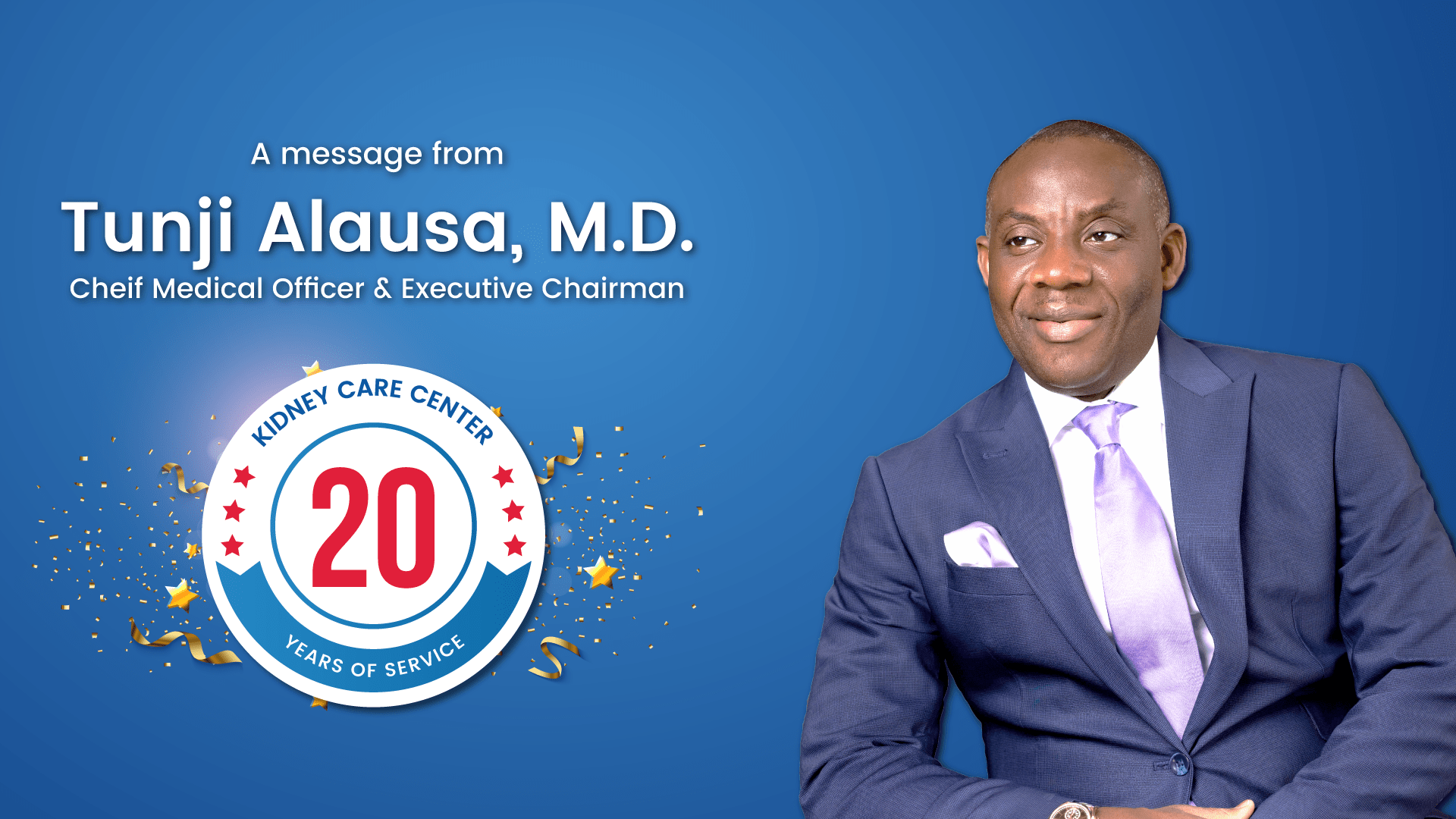 In celebrating this significant milestone of 20 years, Dr. Tunji Alausa, the founder of Kidney Care Center, expresses his profound joy and gratitude. He emphasizes the core values that have guided KCC’s journey thus far and will continue to shape its path forward.